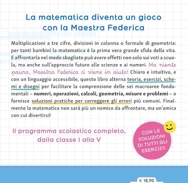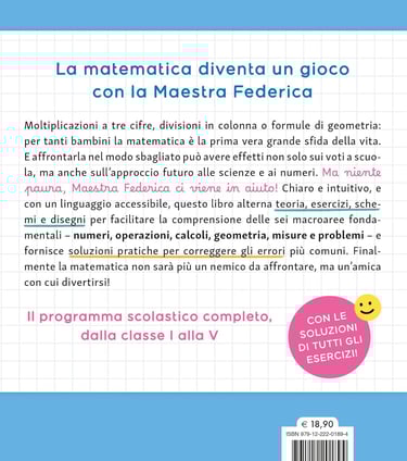 Moltiplicazioni a tre cifre, divisioni in colonna o formule di geometria: per tanti bambini la matematica è la prima vera grande sfida della vita. E affrontarla nel modo sbagliato può avere effetti non solo sui voti a scuola, ma anche sull’approccio futuro alle scienze e ai numeri. Ma niente paura, Maestra Federica ci viene in aiuto! Chiaro e intuitivo, e con un linguaggio accessibile, questo libro alterna teoria, esercizi, schemi e disegni per facilitare la comprensione delle sei macroaree fondamentali – numeri, operazioni, calcoli, geometria, misure e problemi – e fornisce soluzioni pratiche per correggere gli errori più comuni.